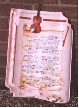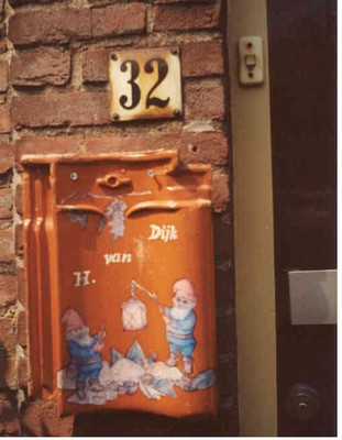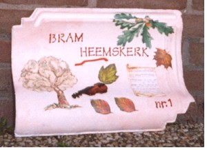 In Holland some people, mostly in villages, have the custom to put their names near the door-bell on a roofing-tile. They also often have those same roofing-tiles on their roof of baken clay. Most of the time they put the upper layer from a table napkin with gnomes, flowers or animals with glue on the roofing-tile. Later they varnish it against the rain. So the pictures are not painted but cut out of a table napkin. There are specialised shops in Holland for this sort of hobby and decoration. You can see an example of such a roofing-tile from family or person H. van Dijk, number 32 with gnomes in my neighbourhood.