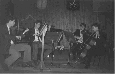 Here a foto of me playing (second violin) in a string quartet, about 10 years ago, when I was a student during our yearly chamber-‘competition’. The chambermusic club of our orchestra (Sempre Crescendo) was C-dur. The color of the orchestra was blue and the color of C-dur was yellow. With an other string quartet I had played SQ KV 421 of Mozart, but here we played Rosamunde of Schubert, also quite easy. But our viola-player was ill so we arrange a substitute. Another problem was that the first violin was forgotten his music, so he had to read from the Quartett music score for all four. We had to repeat one part and we 3 had to turn 1 page, but the first violinist had to turn 5 pages.