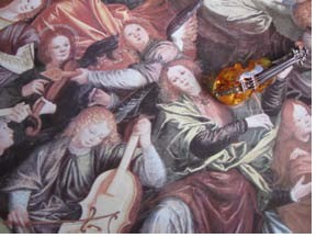 I told about my weblog to a woman in one of my amateurorchestra's and she told she had a foto which I could possible use. First it was a jpg of 500 kbyte, but with the help of a college with adobe professional, I could reduce the size to make it suitable for my blog. The brooch is placed on a sheet with angels, so it looks like a real angle plays this amberviolinbrooch.