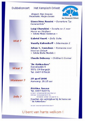 It is my aim to play as much violinconcerto's and pieces for violin and orchestra in my live. For that reason I am playing in an amateurorchestra which is 135 km from where I live. This means 1 1/2 hour (with normal speed)travel to be there and after the rehearsal 1 1/2 hours back in the evening during the week. The soloist is Elodie Mendels, who is studying medicine and studying at the Maastricht conservatory, the city in the south of the Netherlands where Andre Rieu lives. Here the flyer and some pictures from google from Elodie Mendels.