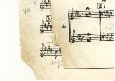 I am playing now with an orchestra the Firebird of Stravinsky. Now we have another edition, but first we got this dirty sheetmusic. I have had sheetmusic which was dirty down under the pages after a lot of turn over by users (often with spittle to get more grip on the pages, which I dislike), but here pieces of paper were ripped of, so big problems with turning the pages, specially when you have to play. V.S. (VS = Volti Subito, turn quick)