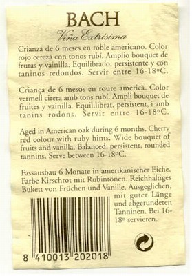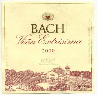 On the frontside the text says: Put in the bottle: Masia Bach, 08635 BARCELONA , Spain. EMB. 421-B R.S.I. 30-1715B. 75 cl. Alc. 12,5% vol BACH Vina Extrisima 2000 CATALUNYA Denominació d’Origen.