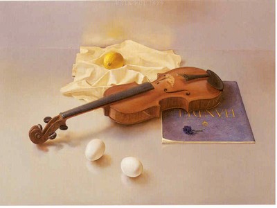 On the card with the eggs, citrons, they wrote on the backside: Rein Pol, Netherlands violin with eggs, 1979 oil on panel 41x56 cm. A still life painting.“Van harte gefeliciteerd” means: hearty congratulations. “En een fijne dag gewenst” means: and have a nice day.