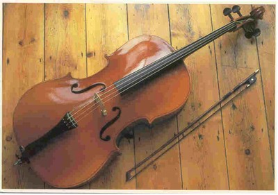 You are right, Neil Cameron. On the backside of the card with the instrument on the wooden floor was: Steve Martin (born 1950) 1984/Hello cello! You can see the iron pin and you miss the black chinthing.