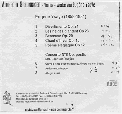From someone I know by www.violinist.com , Carlos Majlis, I got this cd. I had a recording of opus 12 Poeme elegiaque for violin and piano from Frank Peter Zimmerman with also the well known sonata op.27 (Ballade etc, first round candidates of the Queen Elisabeth competition had to play one sonate of the 6 of opus 27), but this version for violin and orchestra of opus 12 Poeme elegiaque is much richer in tone. Also his posthumus violinconcerto nr.8 (are there 7 more?) is good. I wrote to the manager of Albrecht Breuninger Rod Sudbrack and he told that CPO will release the official cd in February/march 2006. I hope there will be no new delay, because it is great music. I know already Chant d’hiver op.15 from a recording of Aaron Rosand on Vox Box, also a great piece. Both pieces make me think of Poeme of Ernest Chausson, which I play soon with an amateurorchestra and a student of the conservatory, who was concertmaster of this amateurorchestra.
