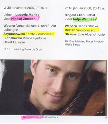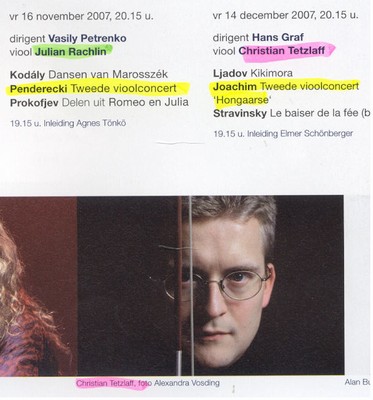 I got the programm of the Rotterdam Philharmonic Orchestra for the season 07/08 and they had in the programming of the Symphonic Adventures 4 RARE VIOLINCONCERTO'S. So I jumped into the air. Earlier Christian Tetzlaff said to me after his concert of Mozart3,4,5 violinconcerto's that he would play the Hungarian violinconcerto2 of Joseph Joachim this winter, but it is now next winter.