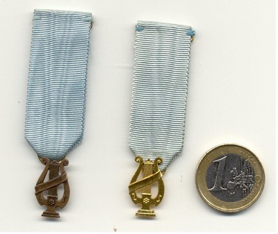 Here a scan of my bronze harp and golden harp/lyre of my studentsorchestra. I played in 1983 and 1984 2 decemberconcerts and after 5 years of not playing violin at all from 1991-1996. In 1992 I got the bronze harp/lyre because of my 4 decmberconcert I played. At that time I had already finished my study, but it was no problem to play longer in that orchestra, although I lived and worked in a factory quite far from that studentorchestra. Because I did not had a car at that time, I have to go by train. But so late in the evening the train did not reach the place where I lived, so I had to bike another 10 km with my folding bike to the place where I lived, so I got my gold medal!! in the end. A silver medal was for persons who have been twice in the orchestra-committee, but I only played.