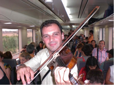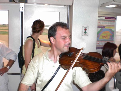This holiday I was with a fiend in Spain, Portugal and south-France for a holiday. The day before I have bought a DIGITAL CAMERA!! During that holiday I made photo's of all violins I saw. But I also saw a guitarist on the strret playing for money and a accordeonist, but also a VIOLINIST in the train near Barcelona in Spain. I made 2 photo's and gave him money afterwards. The played an unknown Irishlike tune and Mozart Turkish march. With my digi camera I also could make films with sound. I forget that to make of this unique moment, SILLY. All photo's were 2,2 Mbite. I could compress them with adobe professional and than save them as jpg-file again, but they are still too big.