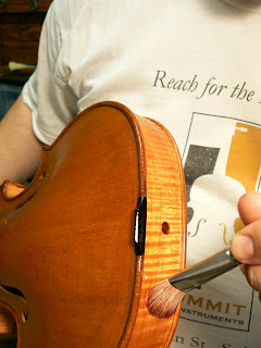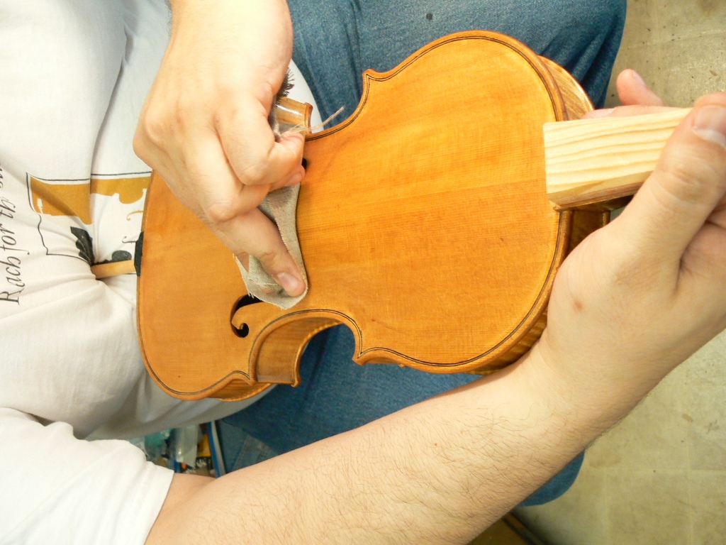 There are a variety of colors to choose from, but that’s definitely not one of them! But in the realm of the earth tones that look so good on violins, there’s still a wide selection: browns, reds, yellows, orange, even a little green (a tiny bit can give an aged look to the violin, but too much and it’ll look like it had some bad mayo with lunch). After thinking about it for a while, I settled on a warm orange-brown, with a little red thrown in for drama.