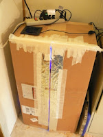 Enter the drying booth! A modern convenience for violinmakers everywhere. It may look like an innocent cardboard shipping box, complete with UPS label on the side. But open it up, and.... surprise!