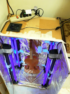 A little aluminum foil, some blacklights (far out, dude!) and you're ready to dry some varnish. My stepson's favorite part is the computer cooling fan on the top. Since the lights have to stay on all night long, it can get hot inside the box and slow the drying process, so the fan keeps the airflow going (there's a ventilation hole in the bottom of the box) and makes sure that everything stays cool. And I mean cool -- a few of these and you have one serious 60's party! I can hear the Doors playing in the background already....