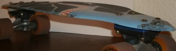 I should add a couple pictures of one of these skateboards because it may be a little difficult to visualise. This looks bad because I had electrical tape on it to protect the edges from my street skater students who had a habit of flipping boards onto their edge, and from loose boards running into curbs.