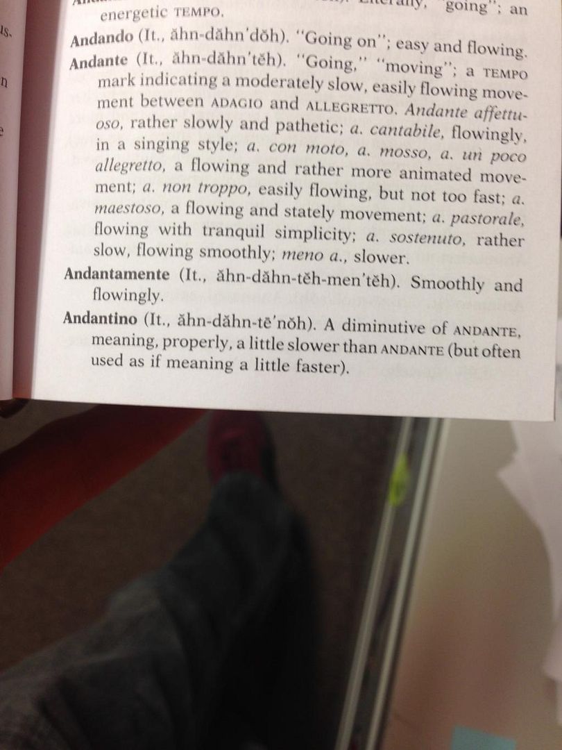 "A diminutive of Andante, meaning, properly, a little slower than andante (but often used as if meaning a little faster)"