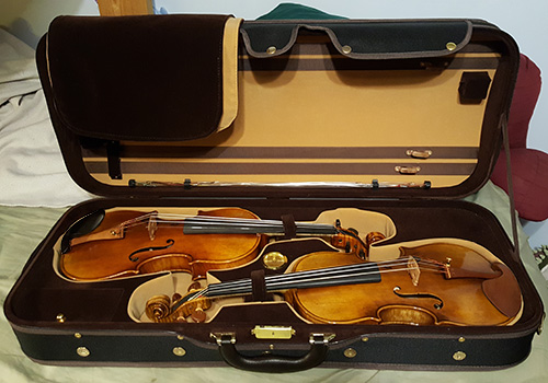 Here is my "travel" viola in it's case. It is a 15.75" viola that I can fit into an Eastman Sinfona case that I have modified to accept the viola (had to move the pads around, and remount them with a hot glue gun). I don't need a SR, so it doesn't require a case to accommodate one of those. It has traveled back and forth to Japan on business many a time...